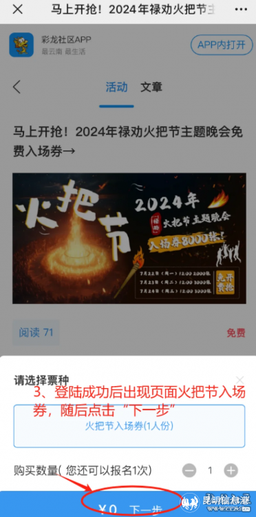 3、出现页面火把节入场券,随后点击“下一步”