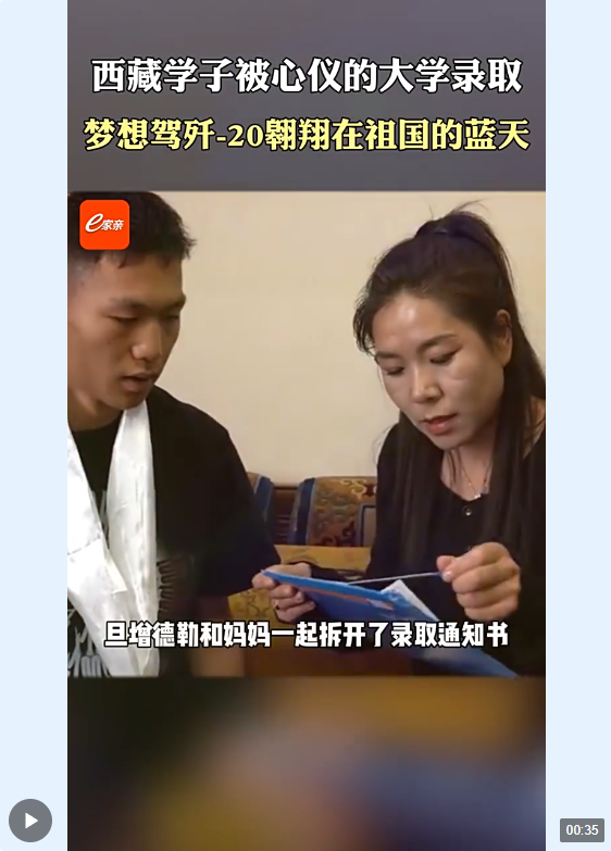 7月19日,就读于拉萨江苏实验中学的旦增德勒收到了中国人民解放军空军航空大学的录取通知书,他是今年全区唯一一个被该大学录取的藏族学子。旦增德勒表示,他的梦想是开着歼-20在祖国的天空上翱翔。