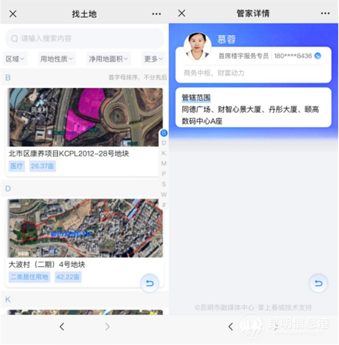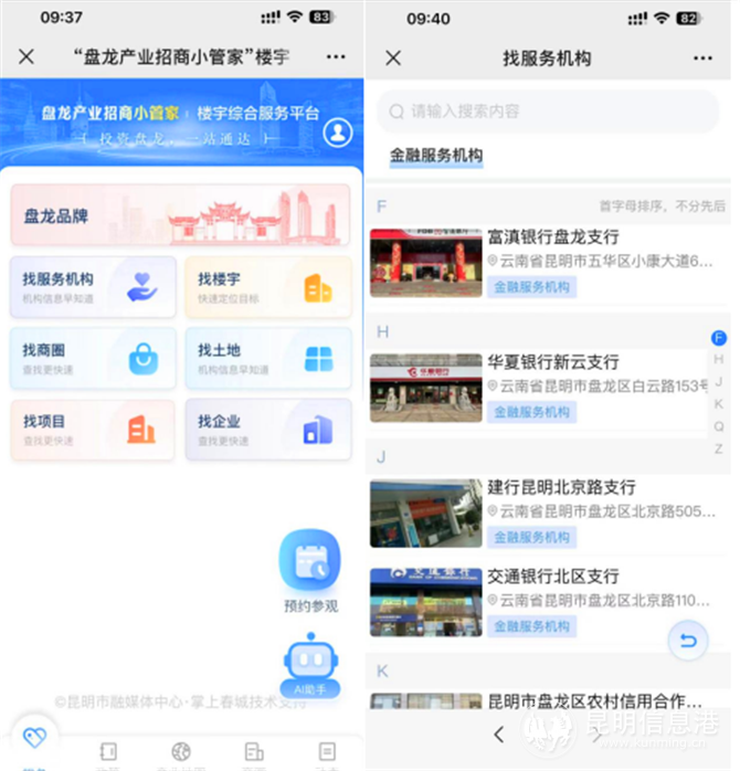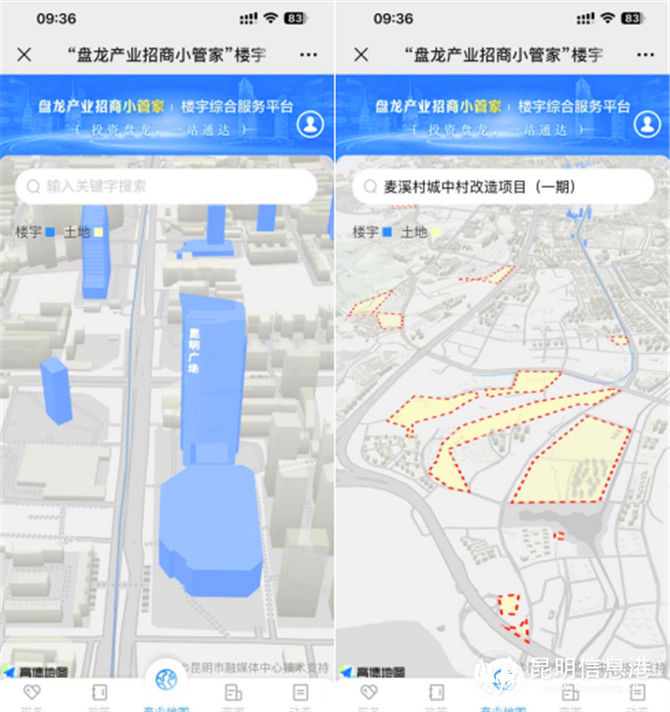 在“找服务机构”“找楼宇”“找商圈”“找土地”“找项目”“找企业”模块,用户可以搜索到楼宇、商圈、土地的周边配套、招商意向、租金情况;可以直达辖区城改项目,了解项目位置、项目范围等详细信息;更能一键找到盘龙区金融服务机构、招商引资区级主要服务机构咨询金融、政务服务内容;平台还支持查看已入驻企业的规模、行业等信息,便于企业进“圈”,产业成“链”。