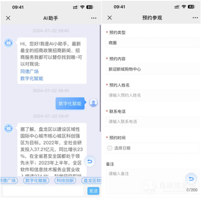 这是一个集合AI助手、参观预约、宣传互动等N种服务的综合平台。对于意向企业服务,平台嵌入AI智能助手,支持意向企业通过关键词搜索,AI助手自动回复,为企业提供24小时全天候服务;意向企业也可以预约参观,填写预约类型、预约内容及时间、电话,平台将匹配对应的楼宇管理员,为企业提供“一对一”楼宇服务。