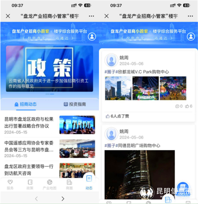 此外,平台还设置“动态”栏目,及时更新盘龙区招商动态、投资指南的相关资讯,不论你是入驻企业、意向企业还是个人用户,都可以通过平台,了解盘龙区在招商引资、楼宇服务、惠企政策方面的最新动态。