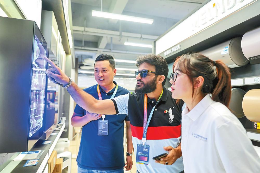 巴基斯坦采购商在新螺蛳湾国际商贸城的家用电器区了解商品信息。