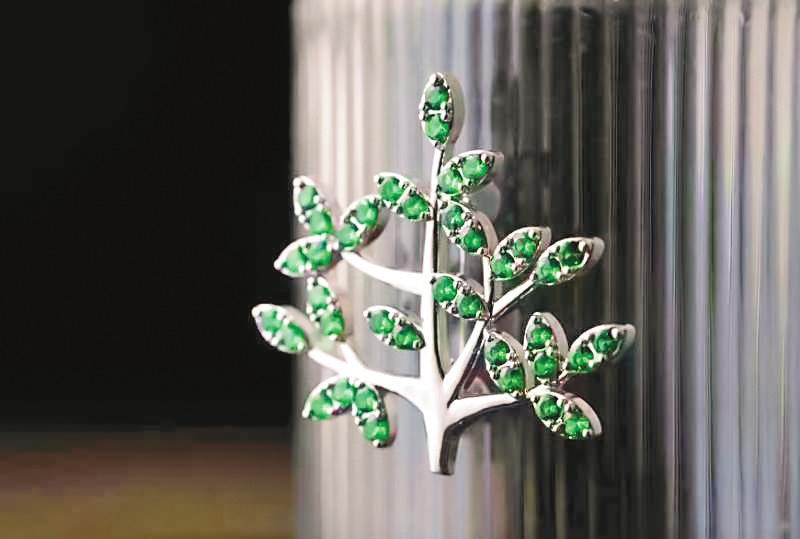 “一叶千年”胸针的设计思路,是想反映世界遗产——普洱景迈山古茶林文化景观的深厚底蕴。在云南省文化馆和北京师范大学的支持下,赵益将景迈山茶树的生机与繁荣融入其中,通过镀银和绿色宝石镶嵌技艺,为胸针赋予深厚文化内涵。
