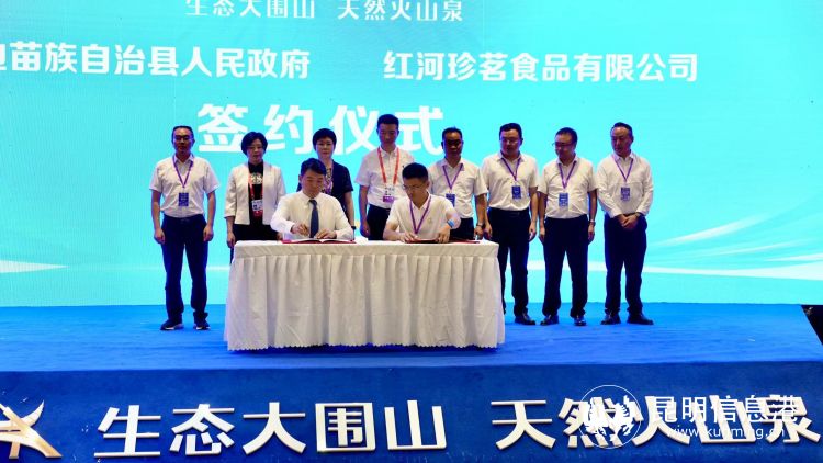 活动上,“滴水苗城”水产业品牌正式发布。屏边县政府与红河珍茗食品有限公司、飞花实业有限公司签订合作协议,助力“滴水苗城”水产业发展,把“生态水”变为“财富水”。相关部门、企业代表现场分别进行品牌介绍和市场分析。
