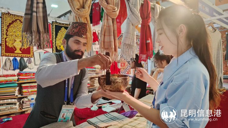 尼泊尔参展商向顾客演示颂钵。记者潘雪婷/摄