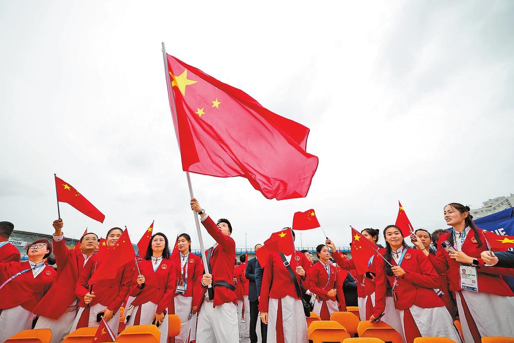 中国体育代表团参加了运动员入场仪式,乒乓球运动员马龙和花样游泳运动员冯雨担任旗手。