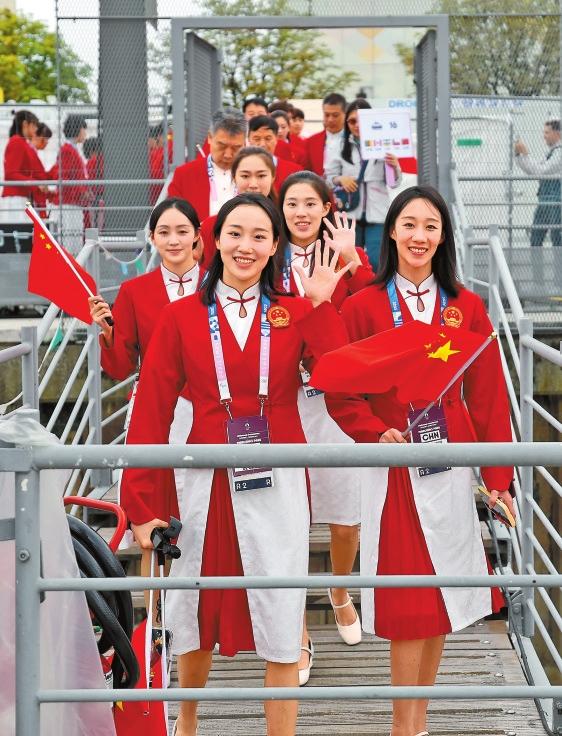 中国体育代表团成员在开幕式前登船。新华社记者 曹灿 摄