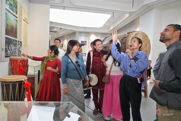 印度青年代表团一行在双语讲解员的引导下,参观了云南文学艺术馆的多个展厅。在文学厅,代表团一行深入了解了云南从少数民族创世史诗到当代文学的多姿多彩;在音乐厅,部分青年代表团成员现场演奏起了展出的少数民族乐器,民族乐器与“印度节奏”的相遇引得不少参展者驻足围观;在民间文艺展厅,代表团一行近距离观赏了独具特色的云南非遗手作,对其精湛的工艺和深厚的文化底蕴赞不绝口。