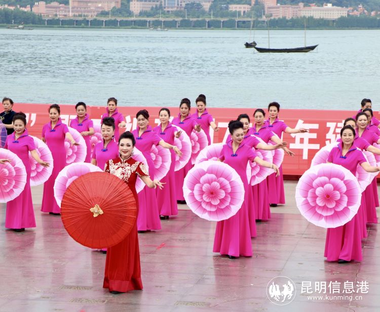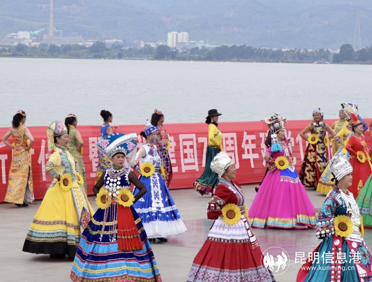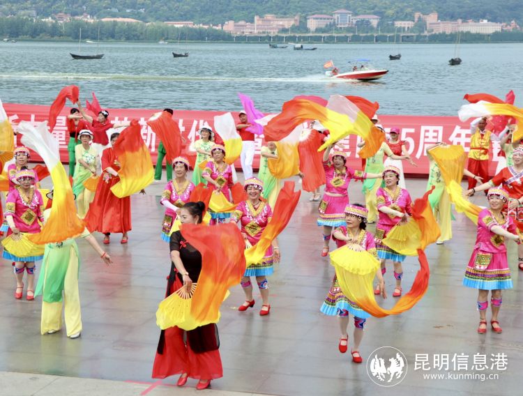 昆明信息港讯 7月27日上午,“凝聚新力量.筑梦新时代”昆明市新的社会阶层人士庆祝中华人民共和国成立75周年系列活动之“寻美云南 和谐民族”大型文艺汇演在海埂大坝亲水平台举行。千余名表演者汇聚一堂,为现场市民带来一场视听盛宴。