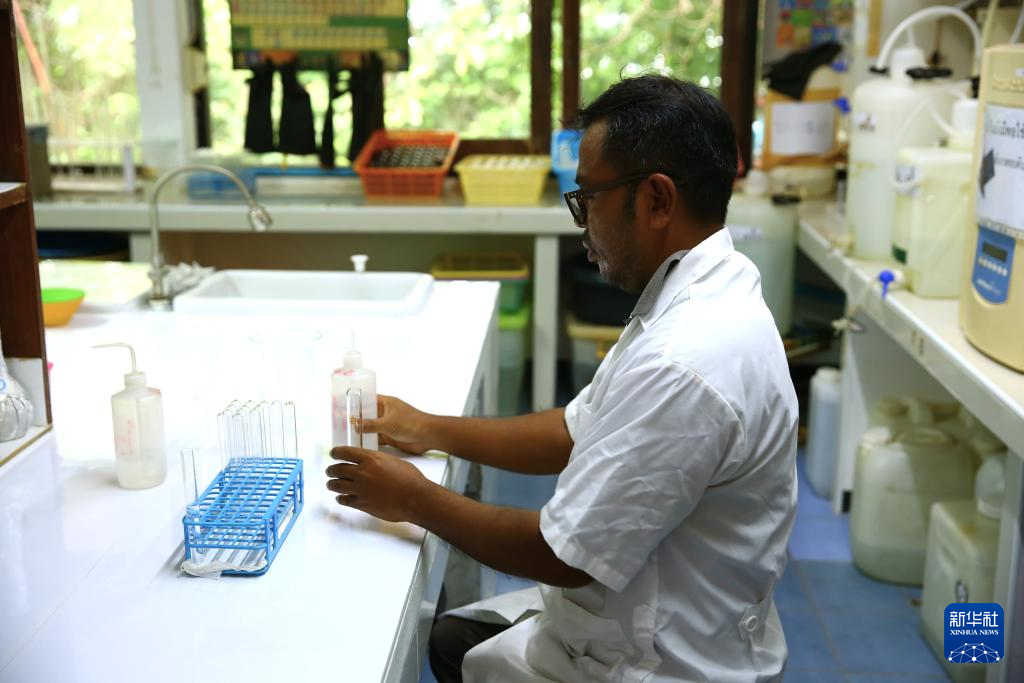 7月23日,在位于泰国普吉的中泰气候与海洋生态系统联合实验室,工作人员进行水质检测。新华社记者 孙玮彤 摄
