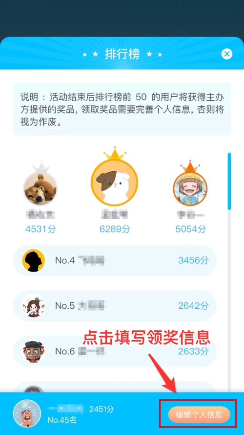 2.本赛季在7月31日24:00结束,前50名参赛者在本赛季结束后5天内进入“积分排行榜”页面,点击“编辑个人信息”填写领奖信息;