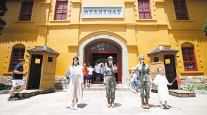 正值暑期,云南陆军讲武堂每天都要迎接来自五湖四海的游客。几分钟的军歌快闪,迅速点燃游客的热情,他们停下脚步观看活动,有的游客还主动加入放声歌唱。