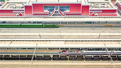 “复兴号”(上)、“澜沧号”动车组列车停靠在中老铁路磨憨站。(新华社记者 胡超 摄)