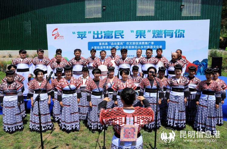 同时,在大秀山精品苹果示范展示基地旁,就是昆明市较大的苗族聚居村——富民县小水井村。小水井村共153户503人,全部为苗族同胞。这里人文资源厚重,民族风情浓烈,世世代代的小水井村民都十分重视民族文化的继承和保护,许多珍贵而独特的民族文化得以保留下来,小水井苗族农民合唱团便是其中最耀眼的一张文化名片。来到这里,游客不仅可以观赏这里山清水秀、红果满枝的美景,品尝美味可口、甜脆多汁的苹果,还能去小水井村体验独特的人文风情。
