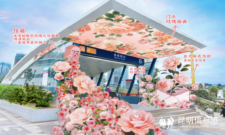 同时,昆明地铁4号线“金桂街站”出站后就能直达斗南花卉市场。为了让乘客更加直观感受到呈贡区“春城花都展示区”浓烈的浪漫,还将在金桂街站的站厅、B通道、B出口门头以花为主元素布景美陈。其中,主题站厅和通道内设置美陈打卡点、花样指引路、花墙、花通道、花门头等鲜花布景,营造“浪漫地铁会客厅”,呈现呈贡斗南花卉的独特之美,让花开在地铁中,留住群众出行的美好记忆。