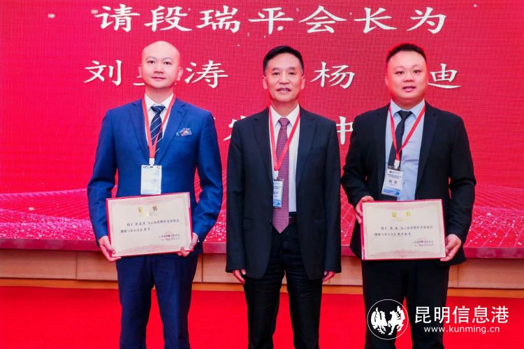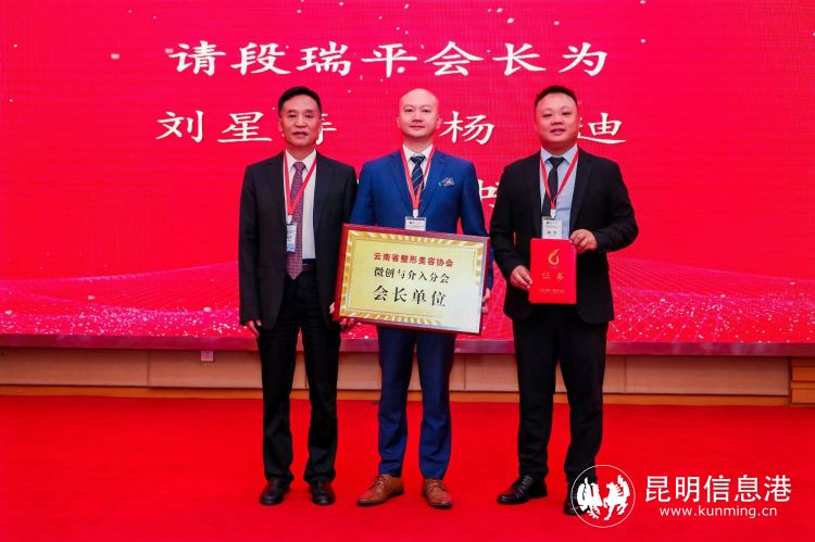 云南省整形美容协会段瑞平会长为云南省整形美容协会微创与介入分会会长单位——昆明新医诚医院授牌,昆明新医诚医院业务院长刘星涛教授与总经理杨迪共同接牌。