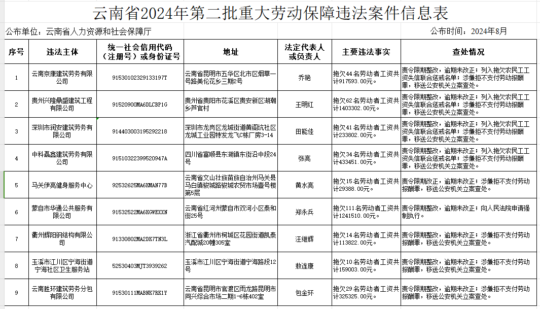云南省人社厅公布9件重大劳动保障违法案件和失信联合惩戒对象6户