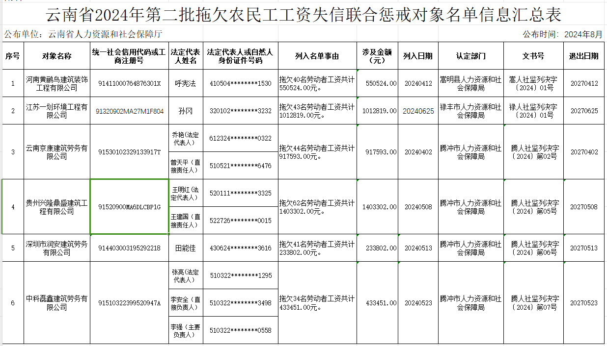 昆明信息港讯 记者江枫 云南省人力资源和社会保障厅近日向社会公布了2024年第二批重大劳动保障违法案件和拖欠农民工工资失信联合惩戒对象名单。本次公布的重大劳动保障违法案件共9件,涉及9户用人单位;公布的失信联合惩戒对象名单共6条,涉及6户用人单位。