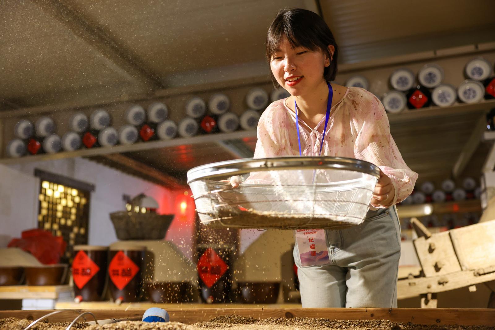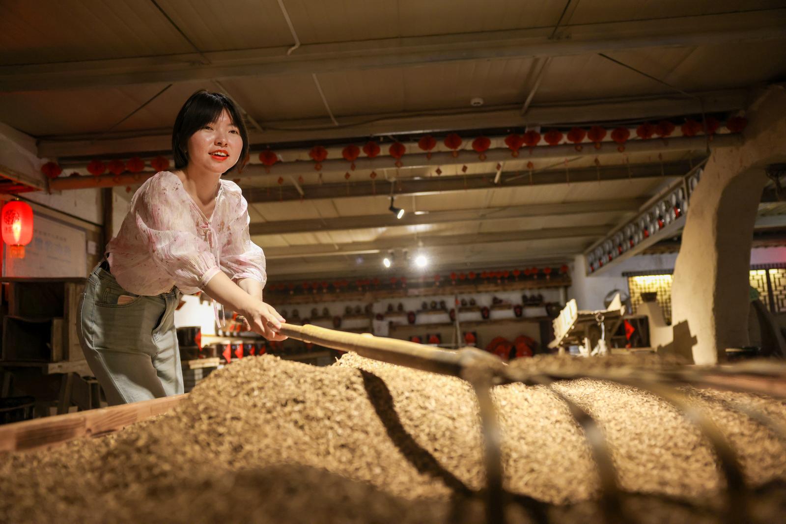 强家老醋文化养生园工作人员正在搅拌酿醋的豆类粮食原料。