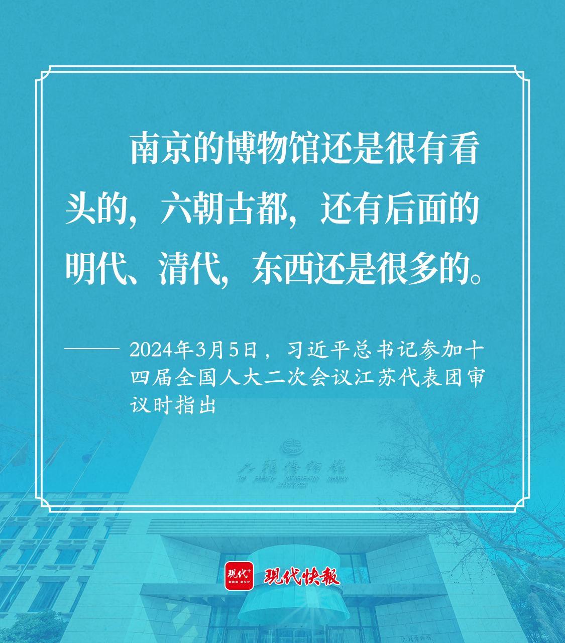 2024年3月5日,习近平总书记参加十四届全国人大二次会议江苏代表团审议。总书记在听完南京市博物总馆副馆长宋燕代表讲述后表示,“南京的博物馆还是很有看头的,六朝古都,还有后面的明代、清代,东西还是很多的。”