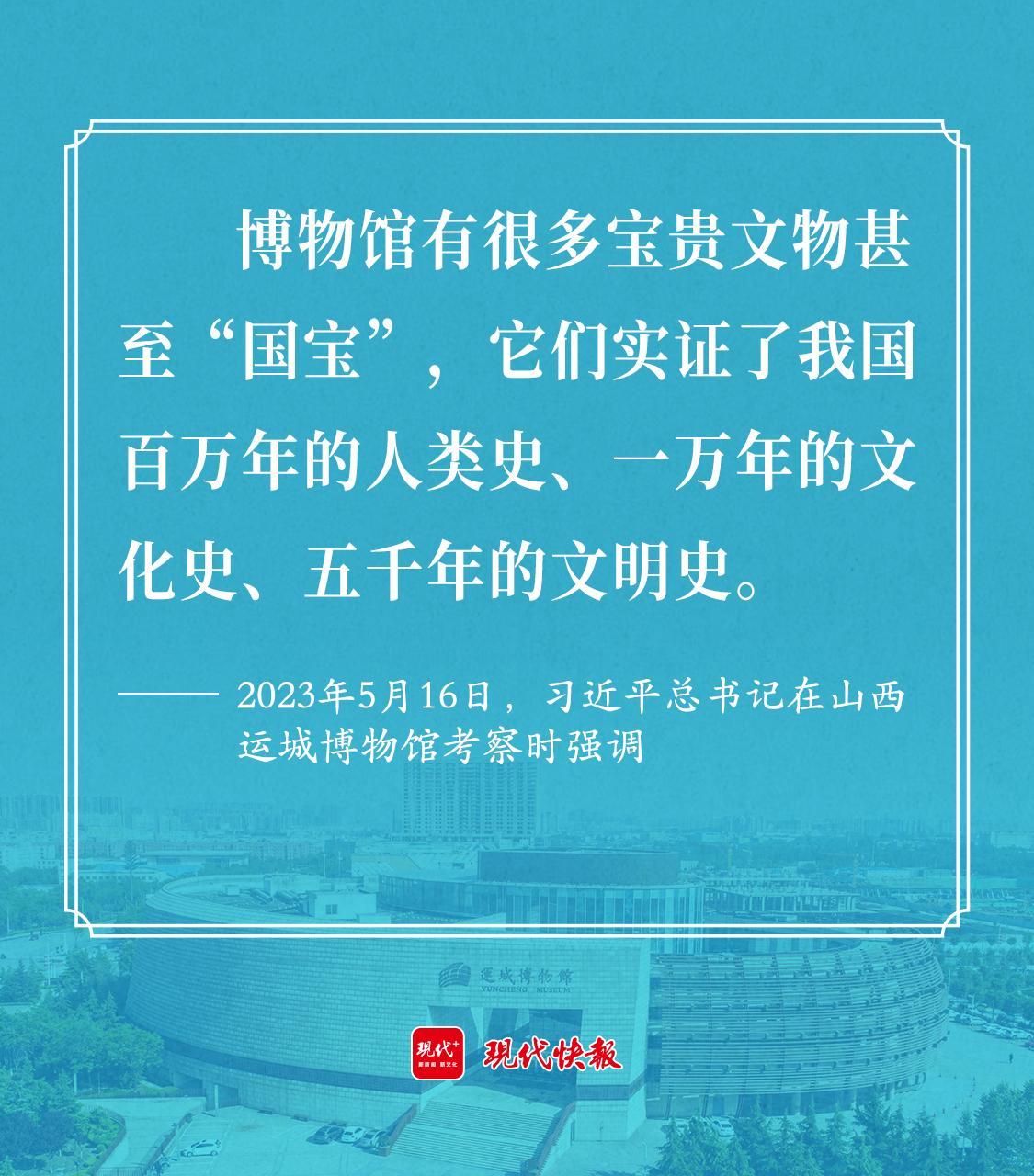 2023年5月16日,习近平总书记考察山西运城博物馆时强调,博物馆有很多宝贵文物甚至“国宝”,它们实证了我国百万年的人类史、一万年的文化史、五千年的文明史。