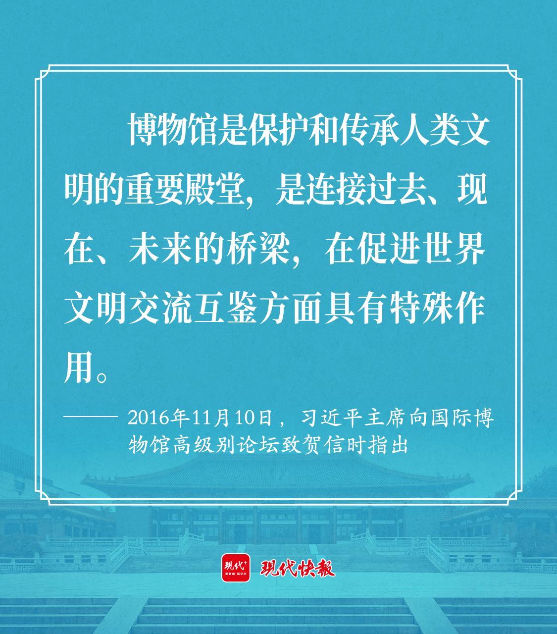 2016年11月10日,习近平主席向国际博物馆高级别论坛致贺信时指出,博物馆是保护和传承人类文明的重要殿堂,是连接过去、现在、未来的桥梁,在促进世界文明交流互鉴方面具有特殊作用。