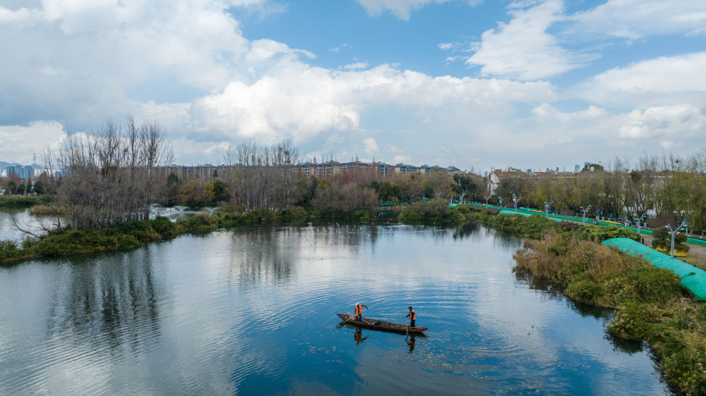 管护人员在滇池打捞杂物(2024年1月16日摄,无人机照片)。新华社记者 胡超 摄