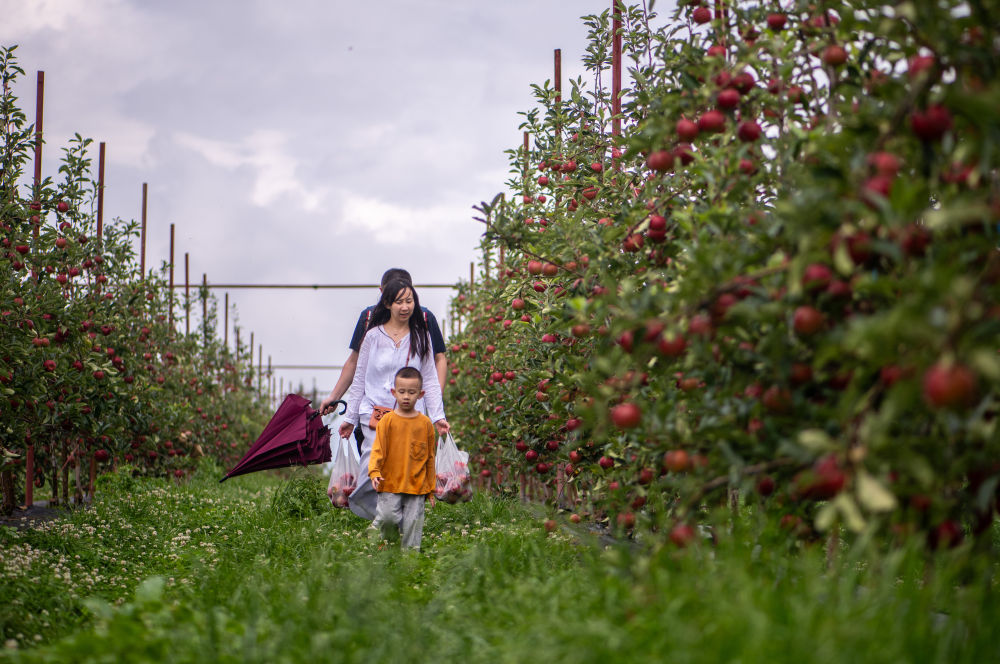 游客在昆明市西山区团结街道双山垭口团结鑫现代农业种植示范园体验苹果采摘(2023年7月23日摄)。新华社记者 江文耀 摄