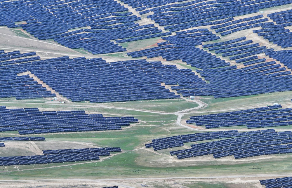 一块块光伏板随山地走势连绵起伏,光伏板下青草日渐茂盛,羊群悠闲漫步其间……板上发电、板下牧羊,是光伏基地也是牧场。这个位于新疆伊犁哈萨克自治州的中国绿发尼勒克县400万千瓦风电光伏一体化项目,以“牧光互补”模式助力绿色低碳发展。