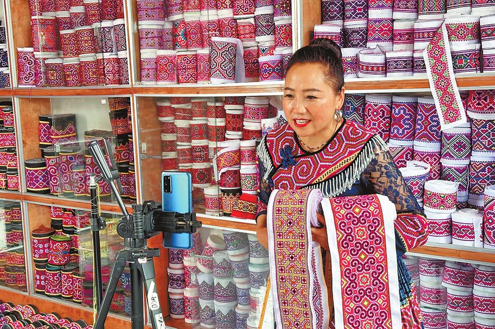 马关县民族服饰产业园电商带货。记者张文峰/摄