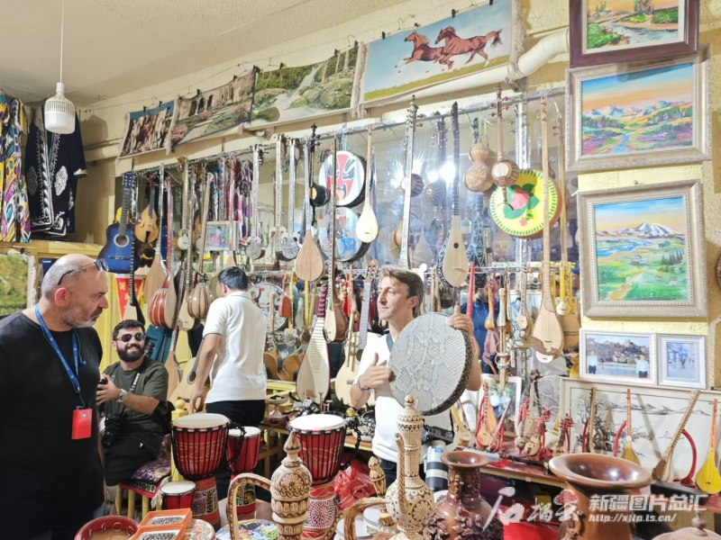 土耳其媒体人在喀什古城木器巴扎店内参观。石榴云/新疆日报记者 宋海波摄