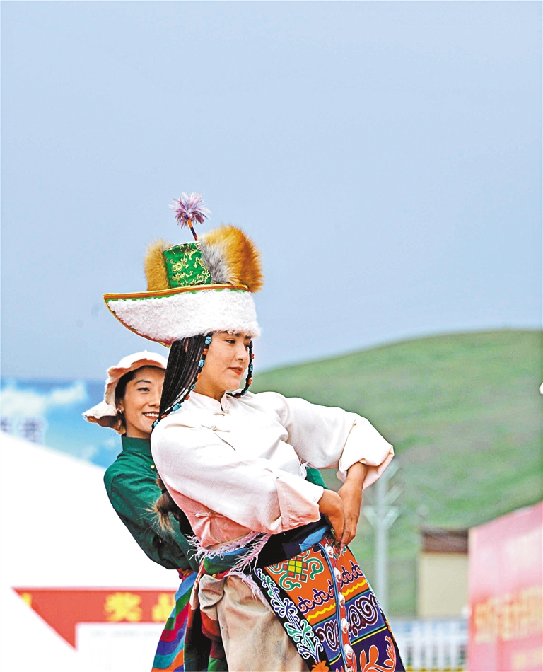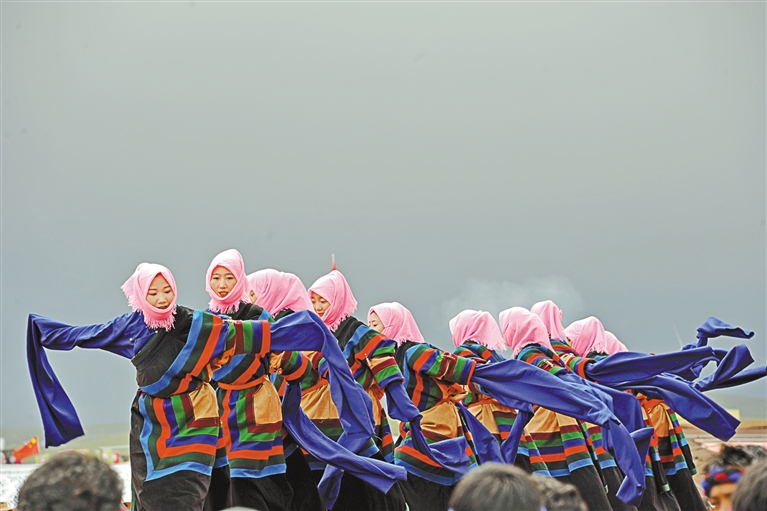 图为班戈县群众在那曲市11县区文艺调演比赛中表演舞蹈。
