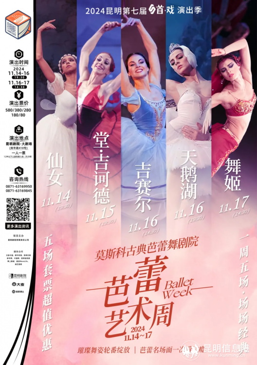昆明剧院携手莫斯科古典芭蕾舞团,一周献上5部世界级经典芭蕾舞剧,除知名度最高的《天鹅湖》外,还有足尖舞“开山之作”《仙女》,“芭蕾舞中的炫技之作”《堂·吉诃德》,“芭蕾之冠”《吉赛尔》,以及“难度最大的芭蕾舞剧”《舞姬》几部经典,璀璨舞姿轮番绽放,芭蕾名场面一次看过瘾,感受古典芭蕾的纯粹魅力。