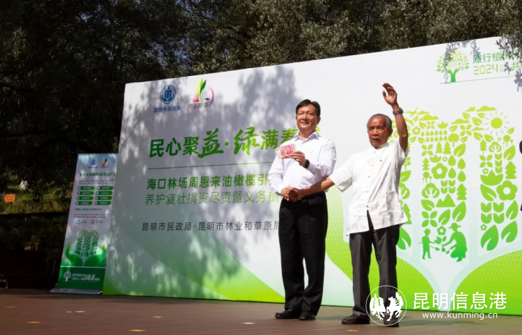 捐资仪式上,昆明市多家市级社会组织积极响应,昆明市浙江商会、昆明市常德商会、昆明市大理商会、昆明市重庆铜梁商会、昆明市重庆长寿商会分别通过全民义务植树网捐赠1万元,用于支持“昆明市海口林场周恩来油橄榄引种示范园养护复壮项目”。