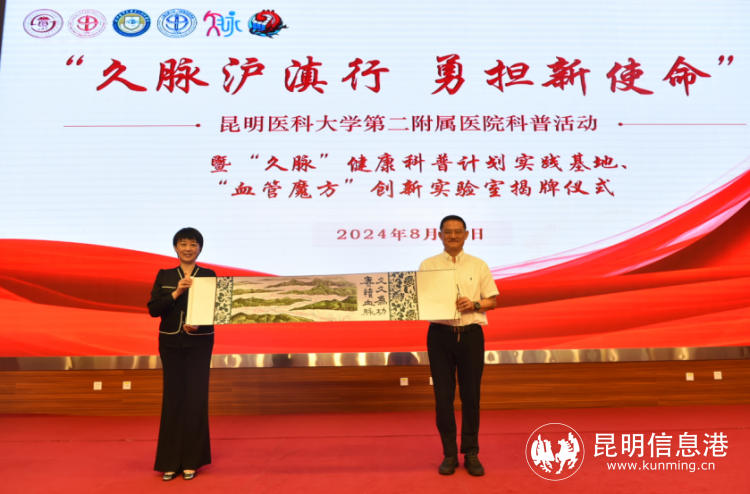 活动中,王丹茹副书记向昆医大附二院赠送了由实践团成员创作的《久久为功,赓续血脉》卷轴画作。这幅画作不仅象征着身体连绵的血管脉络,还象征着血脉相连的师生情,更代表了沪滇血脉相连,源远流长。