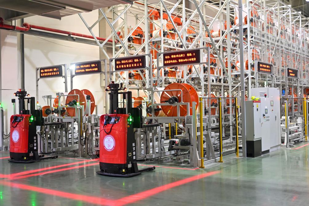 7月26日,无人叉车在杭州中策钱塘实业有限公司轮胎数字工厂车间内装运物料。新华社记者 江汉 摄