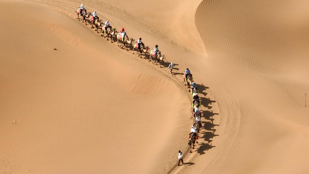 7月26日,游客在宁夏中卫市沙坡头景区体验骑骆驼。新华社记者 吕帅 摄
