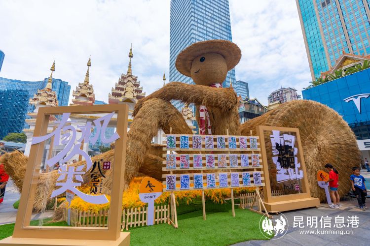 中午,记者来到昆明南亚风情第壹城,只见一个巨型稻草人坐立在广场上,在蓝天的映衬下,极具视觉冲击力。高大魁梧的稻草人坐在一片稻草田中,把乡村田野的原生态与质朴场景带到了城市里,为市民游客呈现一场乡村生态融合城市繁华与巨型艺术装置的盛宴。