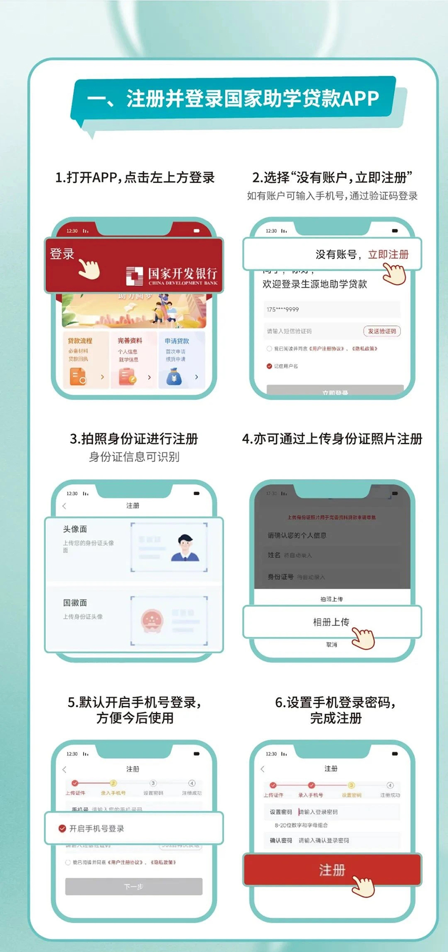 为提升便利性,国家开发银行今年推出了“国家助学贷款”手机客户端,下载“国家助学贷款”客户端后,可在手机端完成国家开发银行承办的国家助学贷款申请、合同附件上传、贷款状态查询、本金延期申请、业务咨询等。以办理生源地信用助学贷款续贷为例,学生只需要通过客户端实名认证,即可提交续贷申请、完成线上签约,整个过程不到3分钟。待高校老师录入回执后,整个申请流程即全部完成,方便快捷。具体操作流程如下: