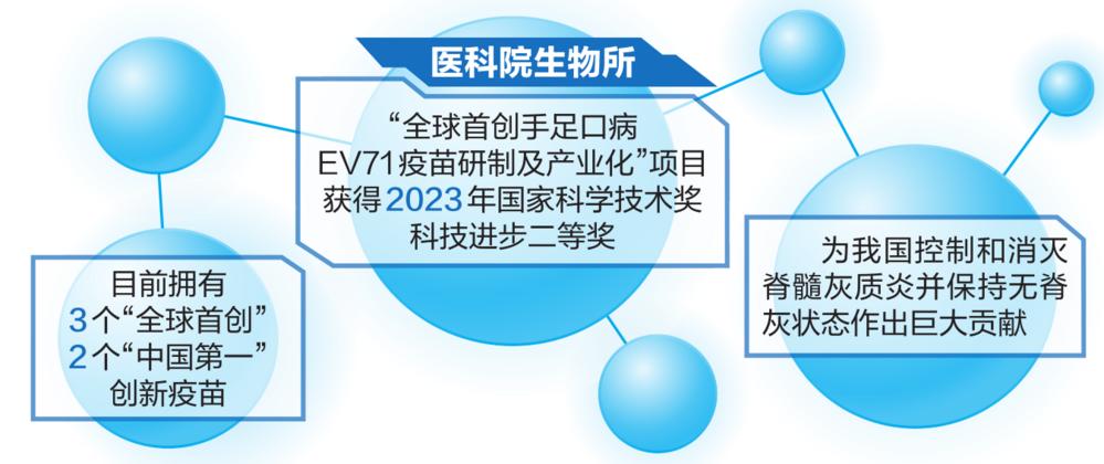 中国医学科学院医学生物学研究所研发的脊灰系列疫苗让中国实现无脊髓灰质炎目标,累计提供超60亿剂次;甲肝系列疫苗有效控制中国甲型肝炎流行,累计提供超2亿剂次;肠道病毒71型灭活疫苗为中国降低儿童手足口病流行、死亡病例作出重要贡献……
