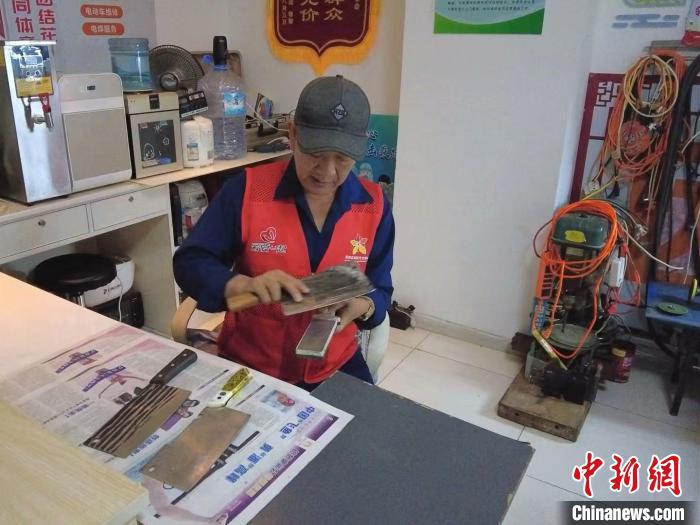 在位于银川市金凤区黄河东路街道的颐和城府社区,从“石榴籽爱心服务站”传出的叮叮当当声吸引了记者们。进门一看,原来是年过古稀的智福德正为社区居民打磨刀具,他身旁的工作台上摆放着各式各样的工具,还有一份写满了服务记录的登记册。