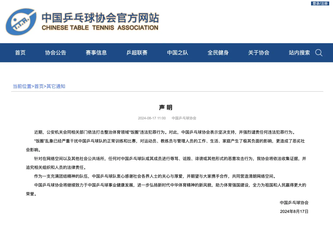 8月15日,公安部公布四起打击整治涉体育领域“饭圈”违法犯罪典型案例,其中有三起涉及乒乓球。今天下午,中国乒乓球协会在官网发表声明,对此表示坚决支持,并强烈谴责任何违法犯罪行为。