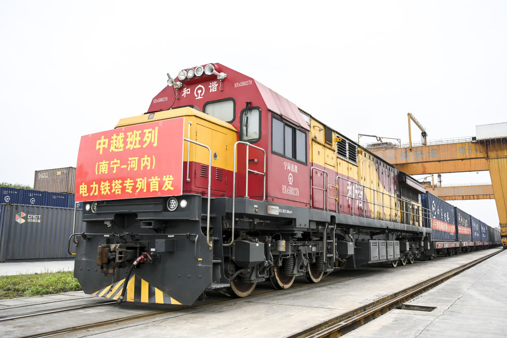 3月8日上午,一列满载340吨电力铁塔的中越班列从南宁国际铁路港开出,发往越南河内。这是广西首次开行电力铁塔专列。新华社记者曹祎铭 摄