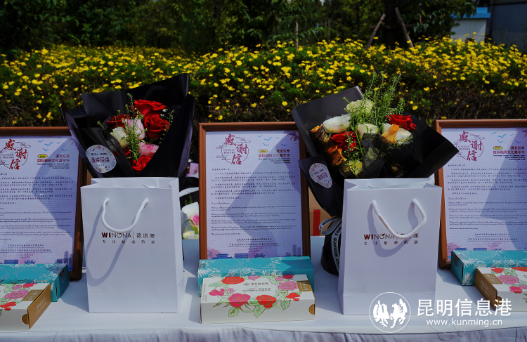 “这是我们的一点心意,希望您能喜欢。”工作人员边说边递上一束束鲜花。紧接着,一盒盒香甜的鲜花饼、松露饼干,以及实用的薇诺娜防晒霜也逐一送达,让主理人们感受到了来自昆明的热情与关怀。