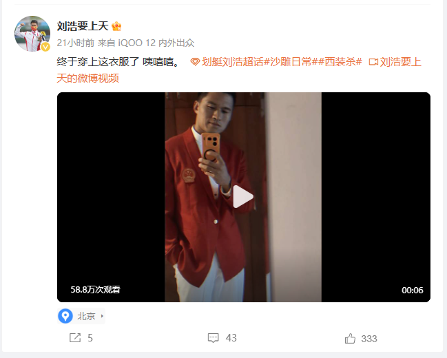 在微博上激动地发文表示: