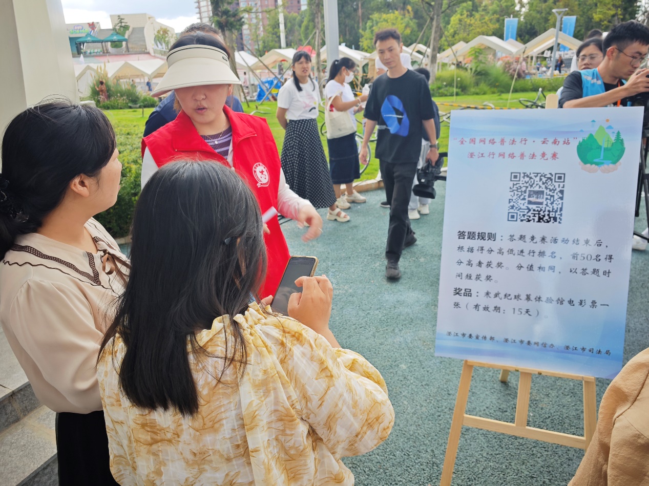活动采取线上扫码答题参与、线下现场互动答题、科普大篷车播放普法视频等形式进行普法宣传,当天赠送游客及当地群众法律书籍、法治宣传制品500余份。