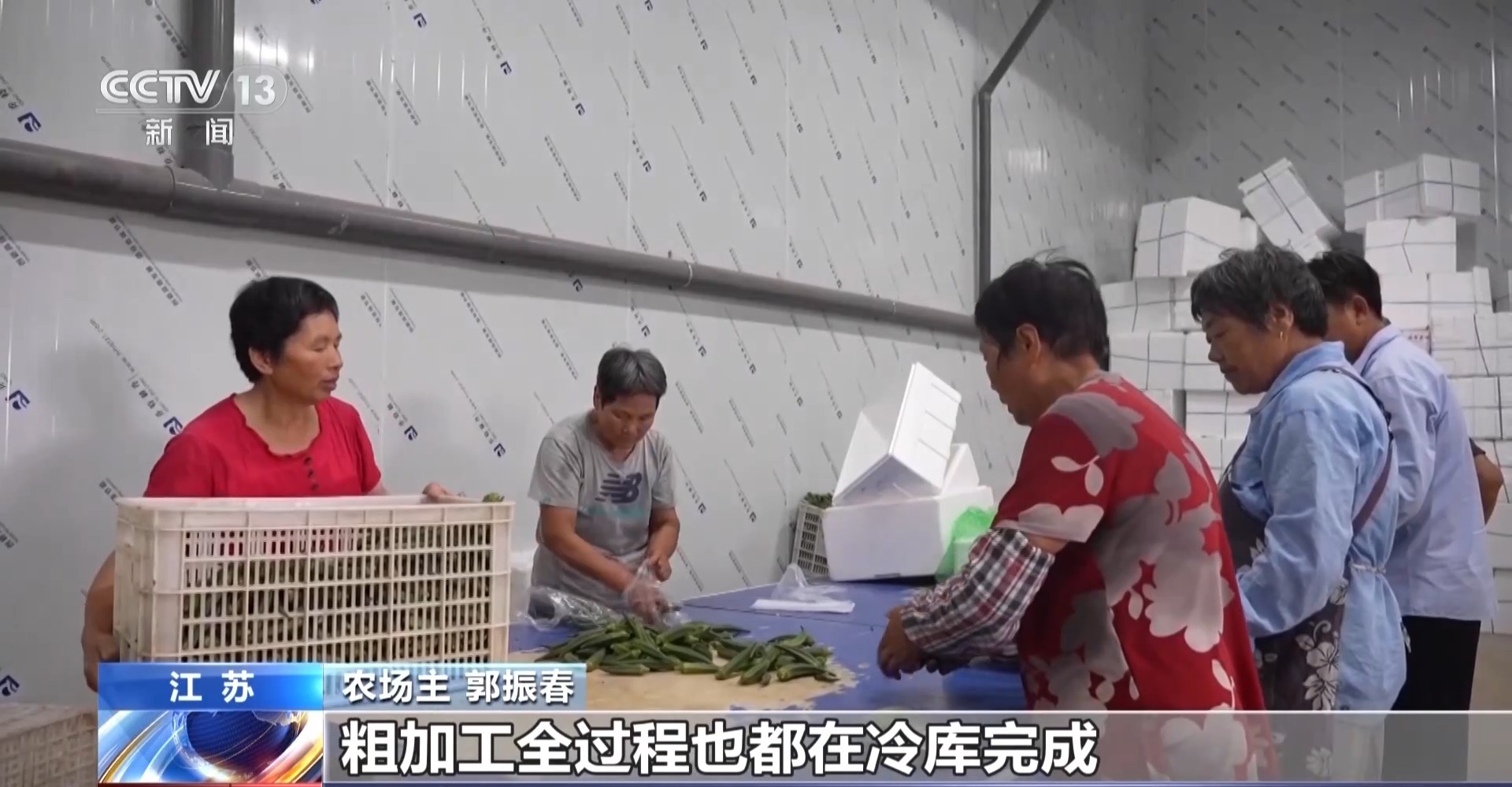 农场主 郭振春:秋葵是一种不耐储存的蔬菜,我们田间采收后,要立即送进冷库预降温4小时,粗加工全过程也都在冷库完成,确保秋葵出库进冷链车的温度一直恒定在3℃左右。