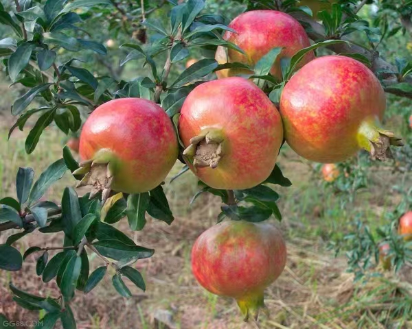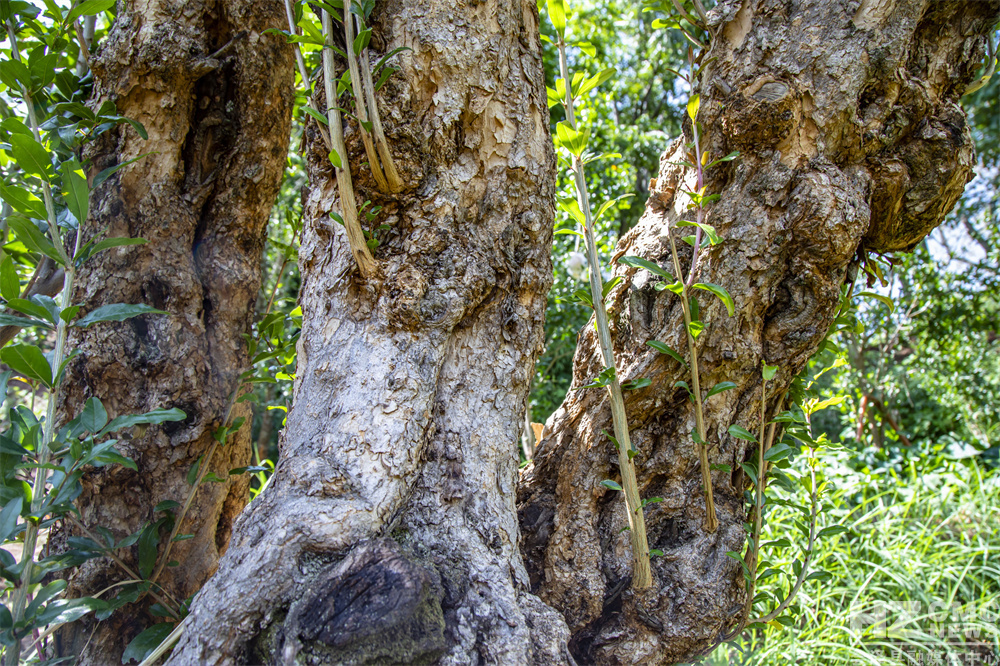 弯曲粗壮的树干象征着岁月的沉淀,深褐色的树皮上裂纹纵横,仿佛在讲述着过去的故事。较小的一棵石榴树为单枝,粗20多厘米,斜于地面生长。较大的一棵石榴树分三枝,每枝直径20余厘米,其中最大的一枝最粗处直径近30厘米。为了保护好这两棵古老的石榴树,颜德洲在树的周围采取了一定的保护措施。古石榴树旁边,漫山遍野的石榴树郁郁葱葱,一个个色泽鲜艳、个大饱满的石榴犹如红宝石般镶嵌其中。