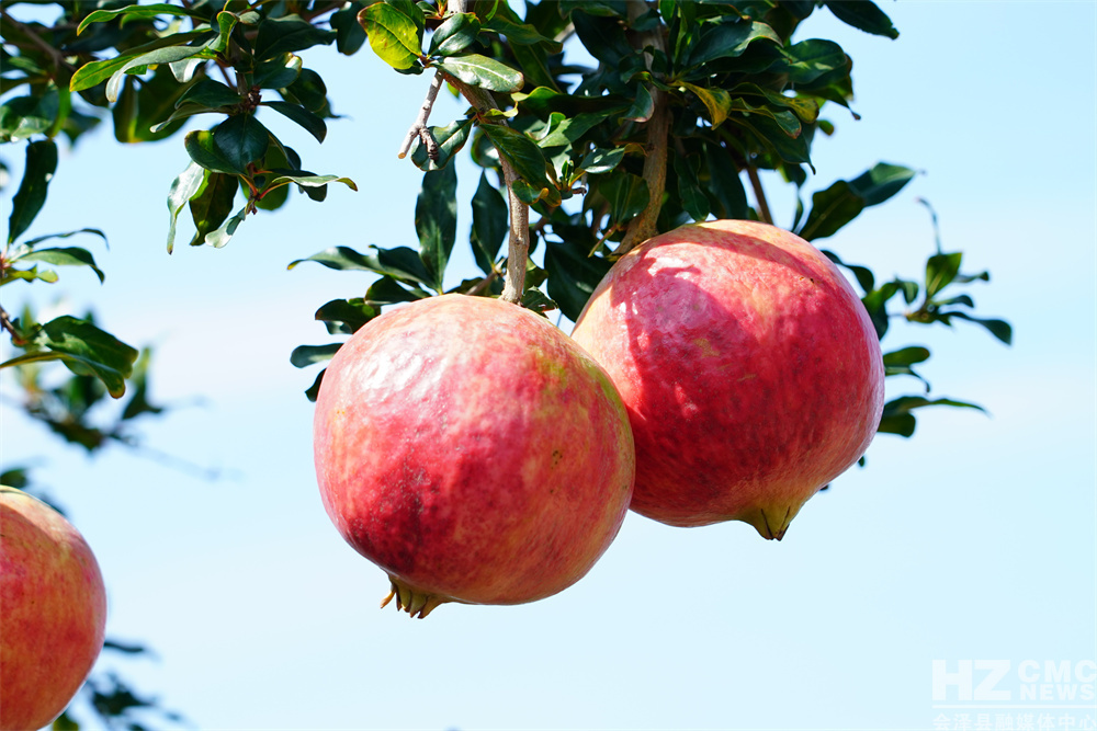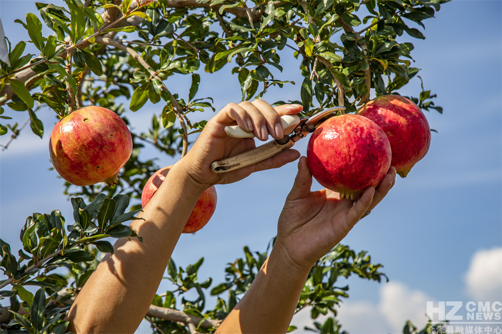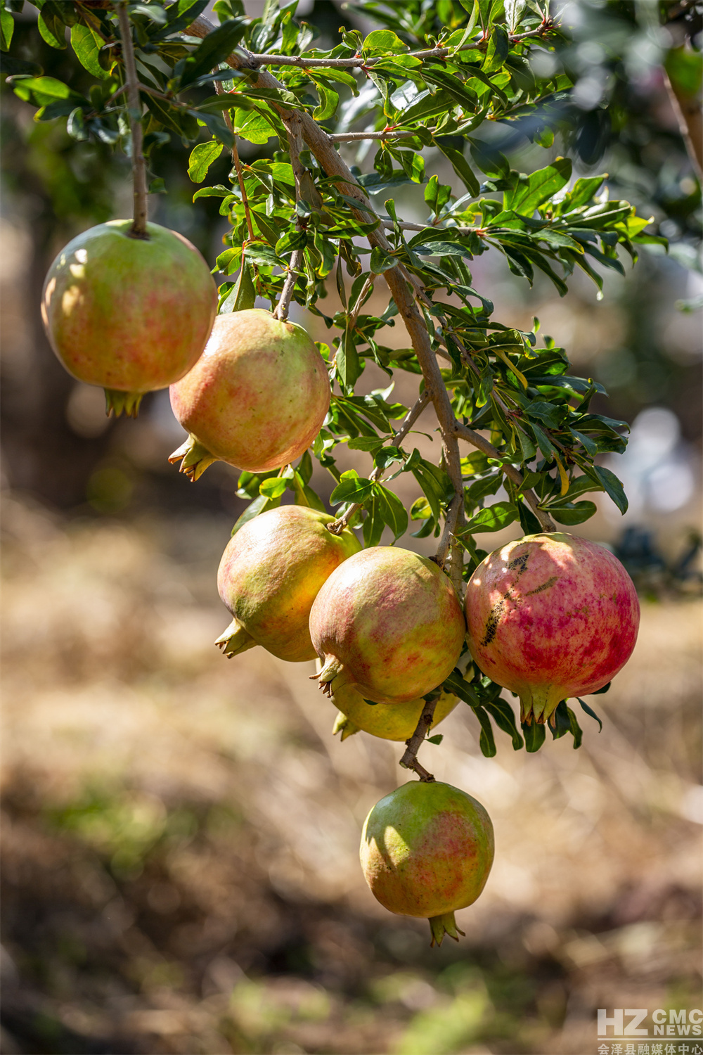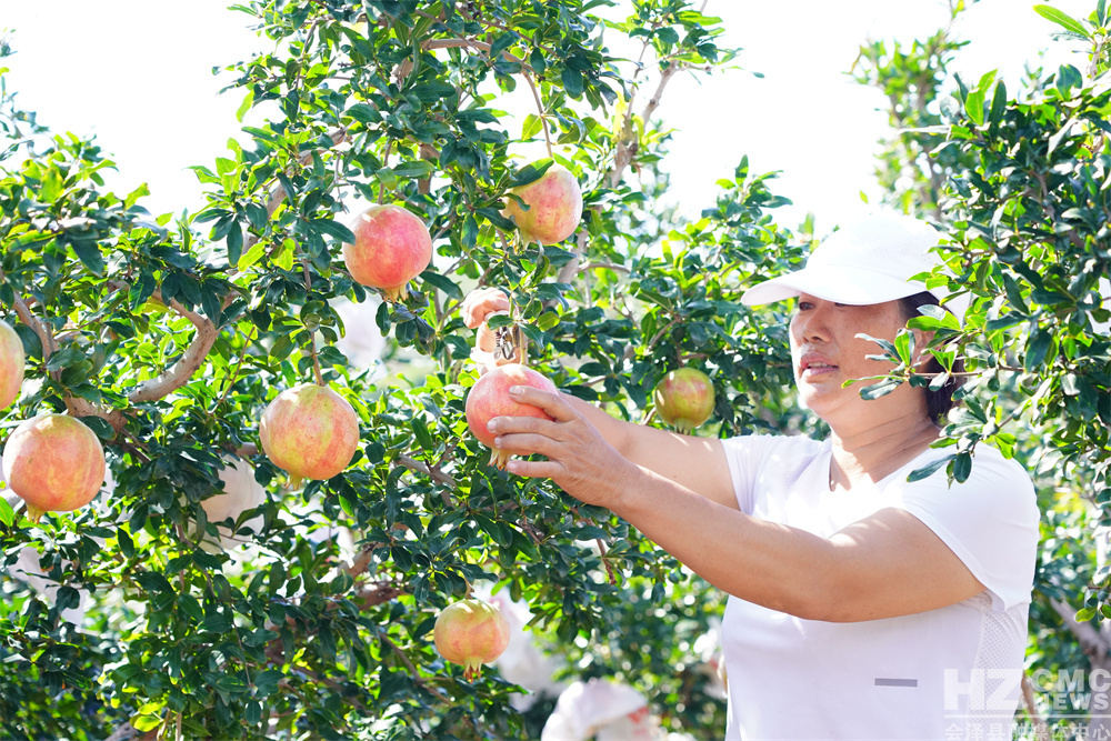 颜梦宝石榴种植专业合作社的石榴园里,一片热闹景象,沉甸甸的石榴挂满枝头,果农们忙碌地采摘着成熟的石榴,脸上洋溢着丰收的喜悦。“每到采摘的时候,要提前几天进行脱袋处理,让阳光直晒,我们俗称‘上色’,这样会使石榴果实更加鲜亮,品尝起来更加爽口多汁。”对石榴的采摘颜德洲也颇有心得。