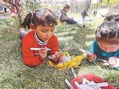 西藏自治区拉萨市城关区第十幼儿园幼儿在户外创作美术作品。